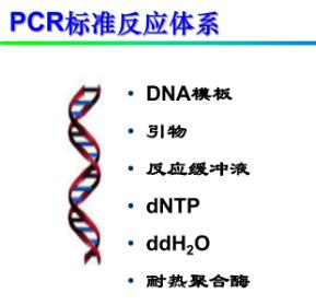 PCR標準反應(yīng)體系由反應(yīng)緩沖液(10×PCR Buffer)、脫氧核苷三磷酸底物(dNTPmix)、耐熱DNA聚合酶(Taq酶)、寡聚核苷酸引物(Primer1,Primer2)、靶序列(DNA模板)五部分組成。各個組份都能影響PCR結(jié)果的好壞。